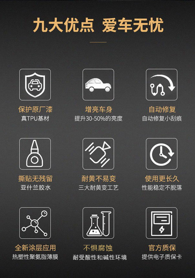 兹梅尔漆面保护膜经过不断创新,综合了目前漆面保护膜的特性,经过无数次的破坏性实验推出漆面保护膜新品系列,产品不仅具有优秀的抗污能力,而且划痕常温下快速自动修复,达到目前行业较高水平。兹梅尔漆面保护膜继续坚持创新、全力以赴保证一如既往的卓越品质,为客户提供一